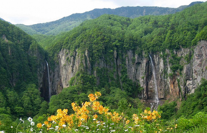 不動滝(落差85m)と権現滝(落差75m)の二条の滝からなる、日本の滝百選に選定される名瀑。